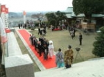 渡良瀬川や浅間山、広大な関東平野が望める織姫山の高台。縁結びの神様に誓う結婚式。手水舎で身を清め神官の先導で昇殿、三三九度の契りなど日本古来の挙式スタイルで。優雅な儀式、壮麗な古式ゆかしい雅楽の生演奏は感動的。本殿には、30名ほどが参列できる。