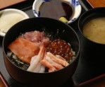 杉津パーキングエリアの人気No.1の食事メニューは、「日本海夕日の海鮮丼」。ピカピカのコシヒカリの上にカニ、甘エビ、サーモン、トロ、イクラの5種類の魚介がたっぷりのった豪華な一杯。