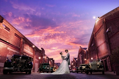 入口を入ってカフェを抜けるといきなり異空間。赤レンガ倉庫をバックにクラシックカーが展示され、昔のロンドンやニューヨークの裏路地にタイムスリップしたかのよう。ボニーとクライドみたいに、カッコよくポーズをきめて記念写真をパチリ。