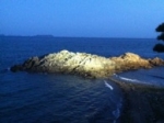 「大石名残の松」の先にあるのが「たたみ岩」。神社の祠があり多くの人々の信仰を集める場所でしたが、いつのころからか恋人たちが「たたみ岩」で愛を誓うと恋が成就すると言われるように。1日に2回、潮の干満によって岸から「たたみ岩」まで道が出来て、わずか数時間だけ歩いて渡ることが出来る。ライトアップもされるようになったので幻想的でさらにロマンティックに。
