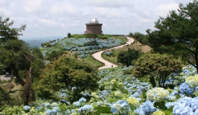 例年6月下旬から7月中旬頃には約16000株のあじさいが斜面いっぱいに咲き誇る。空の青とあじさいの青が溶け込む様子から『天空のあじさい』として親しまれている。 中にはハート型のあじさいも。2人の思い出にフォトジェニックな1枚を!