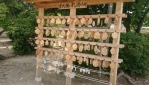 町のマスコット雪丸をかたどったかわいい絵馬にお願いごとを書き込んで。絵馬は奈良吉野のヒノキで出来ていて、障碍者支援に取り組むNPO「なないろサーカス団」の手作り。