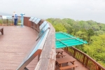 山頂の桟橋デッキにはイス付きのテーブルや折り畳み式の日よけなどが、約70人分用意されている。さらに東屋もあるので山頂で長居してしまうこと間違いなし。絶景を眺めながらお茶したりおしゃべりしたり、思い思いに過ごしてみては。