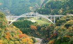 美里町の象徴とも言える棚田を見ながら内大臣橋へ。石垣が連なる棚田は、日本の原風景ともいえ、田植えが済んだ頃には、田んぼに夕陽が映える。内大臣橋は、アーチの中間に道路が通る珍しい橋。さらに上流には紅葉の名所にもなっている緑仙峡内大臣峡がある。
