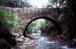 1828年に架けられた橋で、現存する石橋としては熊本県全体でもベスト20に入る古さ。昼間でも薄暗いほどの深い谷に、どっしりと構えるように架かっている。コケに覆われた欄干や壁石、清流のせせらぎなど、馬門橋は不思議な雰囲気を醸し出している。