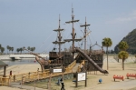 ビーチの西側にあるのは、カピタン号という帆船の大型遊具。遊具だからといって子どもの遊び場だけにするのはもったいない。二人で帆船の上に上がってみよう。撮影のアングルに寄っては、「ここはどこ?海外?」のようなカットが撮れる。