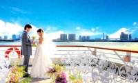 解放感溢れるオープンデッキでは船長式はシンフォニーならではのオリジナル挙式。青い空と海も人生の船出を祝福してくれる思い出に残る1日が過ごせる。