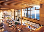 館内に一歩入るとそこは、明るい日差しがそそぐ別世界。ロビーは天井が高く、南欧のリゾート地を思わせる落ちついた色調の大理石でまとめられ、蒼い海と空を望む大きな窓が印象的。海の彼方には霊峰富士の姿も。ロビーにはテーブルとイスが配置され、ティーラウンジも兼ねている。素晴らしい景色を眺めながら贅沢な時間を過ごして。