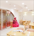 挙式前の花嫁のためのブライズルームがリニューアル。女性ブライダルプランナーがこだわって選んだソファや小物がオシャレ。これなら花嫁もリラックスできる。広くて静かなブライダルサロンには6人掛けのテーブルを用意。両親も同席してゆったりと打ち合わせができる。