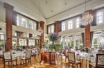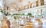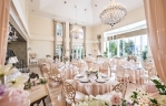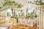 水上にガゼボが浮かぶガーデンのオリエンタルなリゾート感と、英国風の品格が見事に調和。貴族のマナーハウスをイメージした開放的なダイニングは天井が高く、螺旋階段からゴージャスに入場するのも◎。日差しが心地よいコンサバトリーなど、多彩な空間を活用してふたりらしいパーティーを満喫したい!